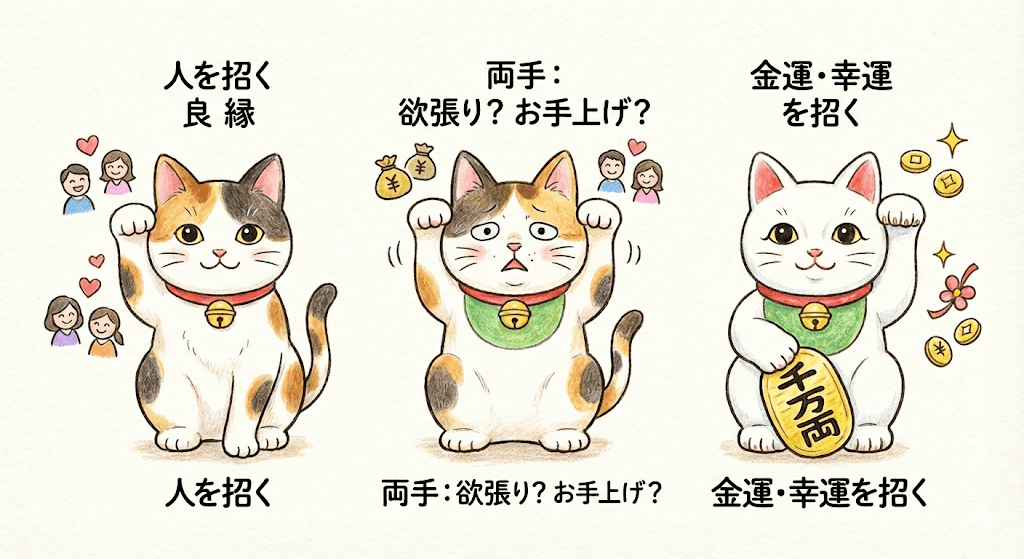一般的には、右手は「金運」や「幸運」を招く、左手は「人(客)」や「良縁」を招くとされています。