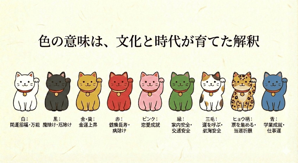 招き猫には、右手・左手・色・置き場所ごとに意味があります。